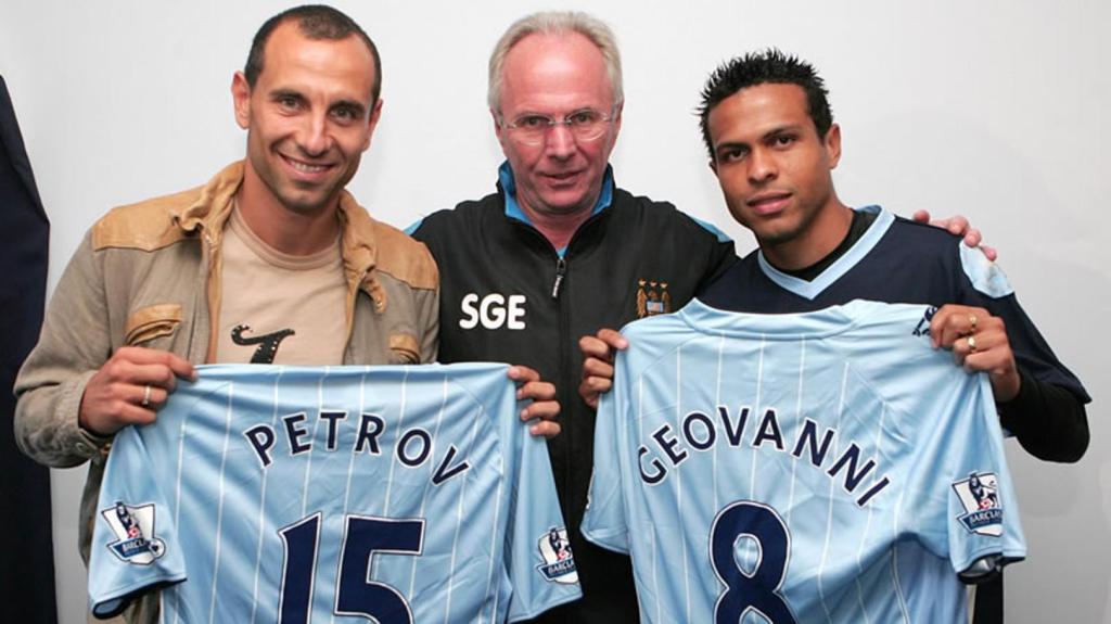 Manager Sven-Goran Eriksson with Martin Petrov (left) and Geovanni (right)